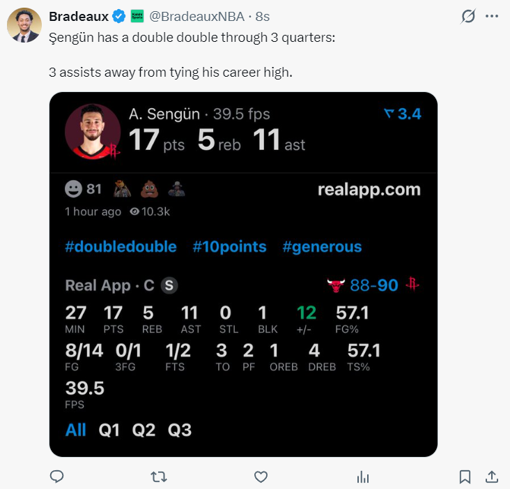 申京第三节的表现太出色了,他以一己之力让火箭的进攻变得流畅,连续助攻戴维森拿5分,连续助攻杜兰特拿4分,还助攻两个阿门,单节4分1篮板6助攻,三节17分11助攻5篮板,还差3个助攻就平生涯助攻最高。