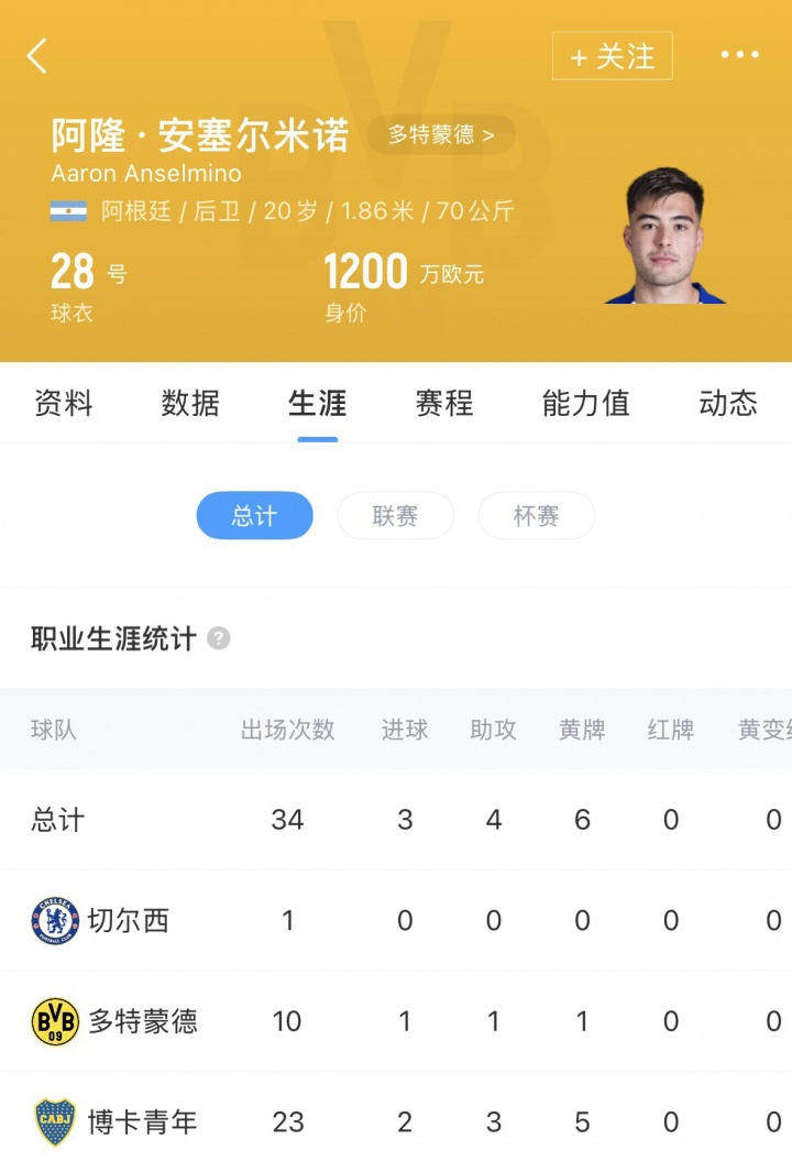 安塞尔米诺共代表多特出场10次,出场时间585分钟,1球1助。